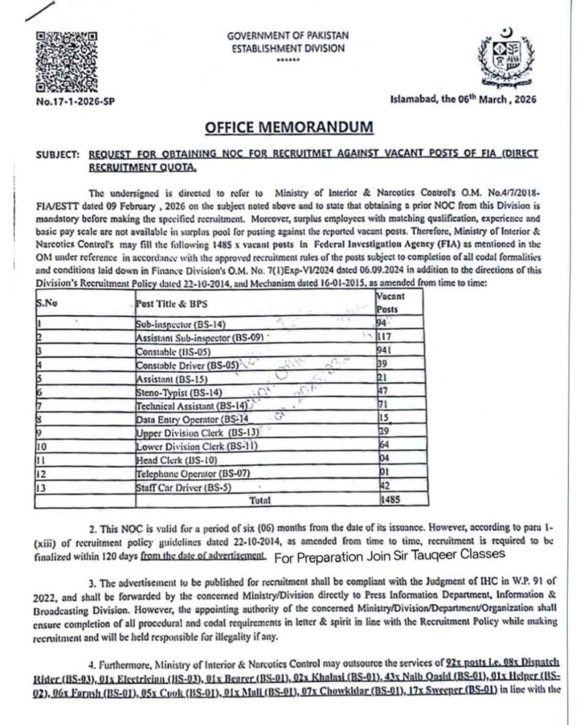 The Government of Pakistan Establishment Division issued a notification on March 6, 2026. This notification is the NOC (No Objection Certificate) for recruitment against vacant posts in FIA. This means FIA jobs 2026 online apply will start very soon.